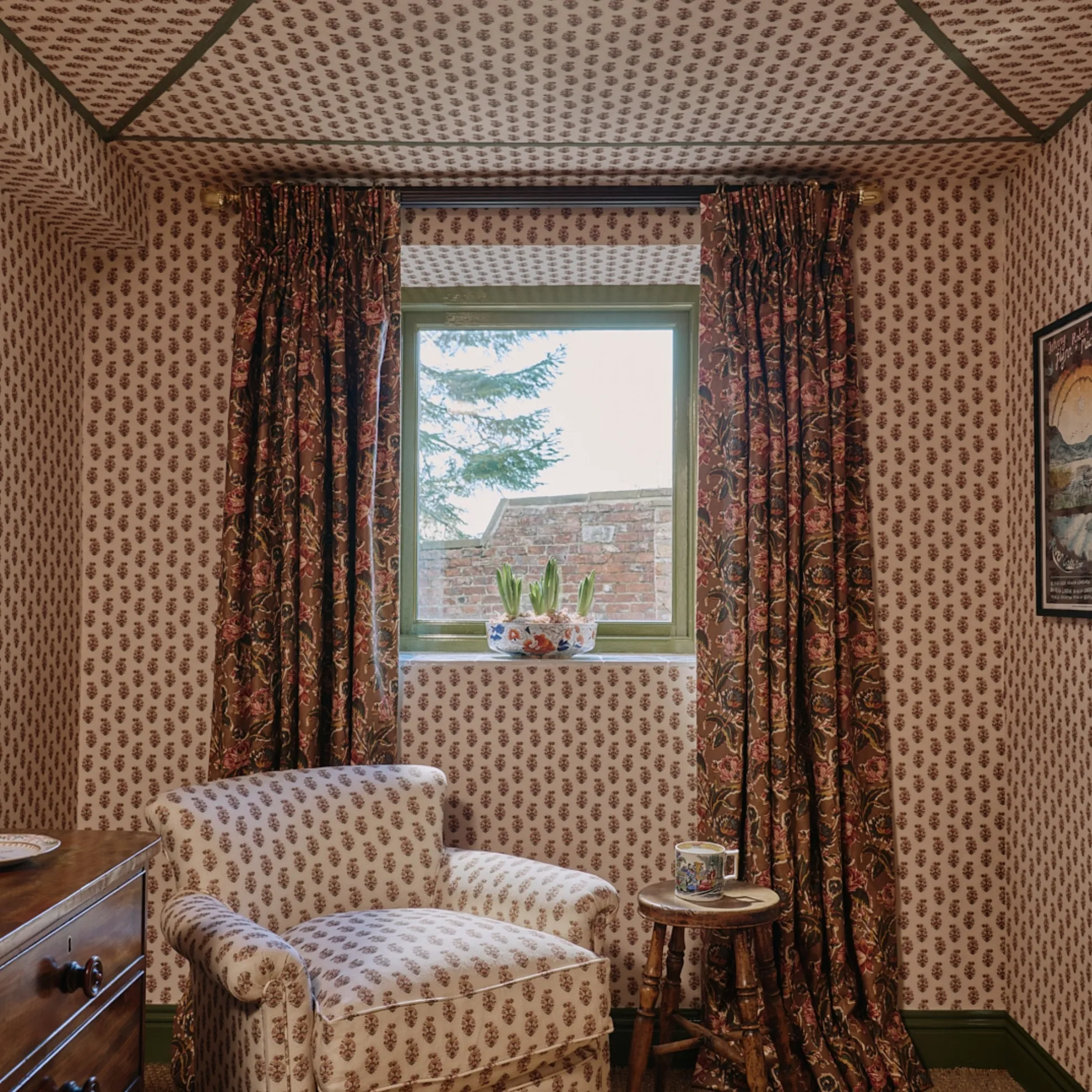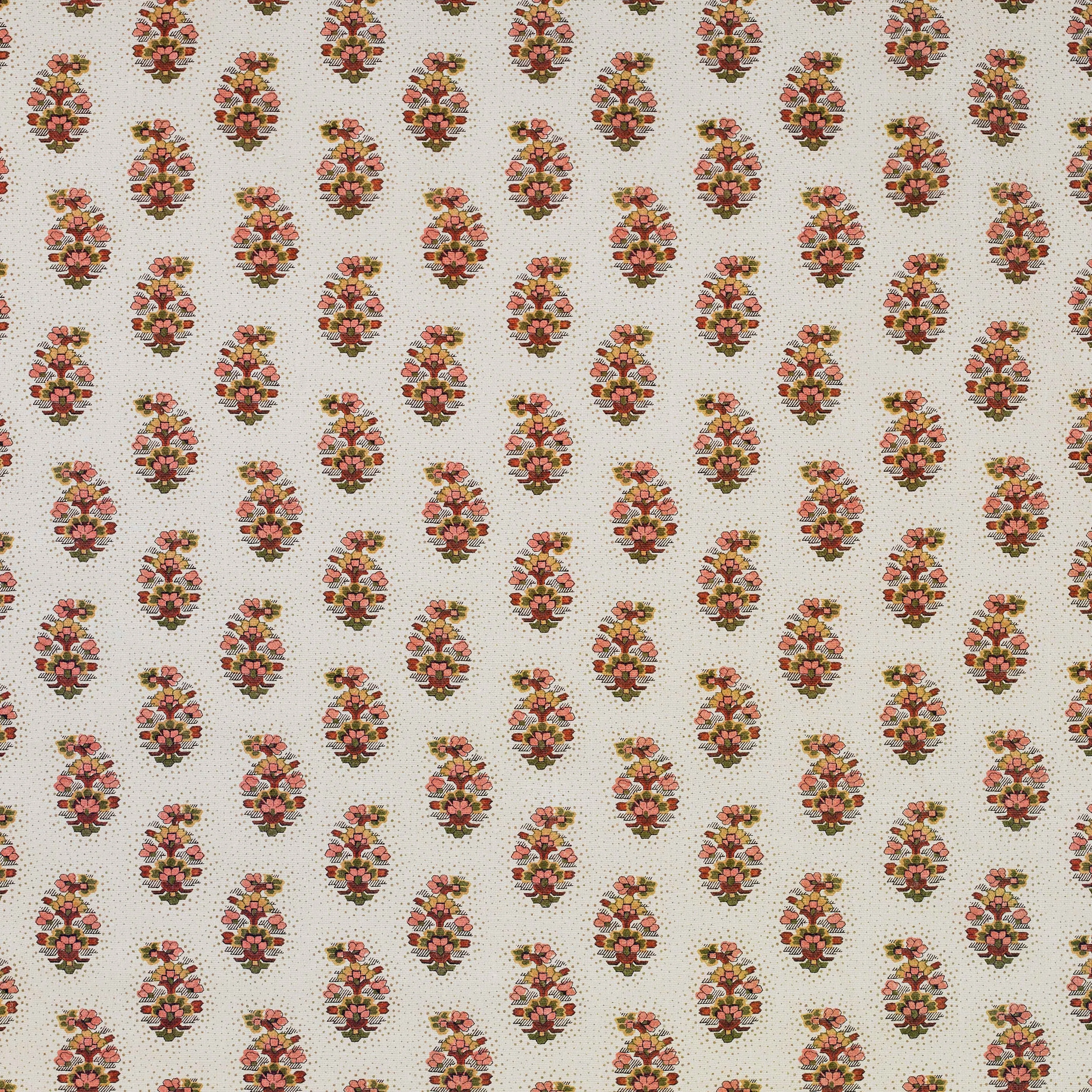 Gussie in Damson features a mid scale paisley design set against a soft ivory ground, with a considered mix of plums, pinks and greens bringing richness and depth to the motif. Delicate dotted detailing creates a beautiful layering effect that subtly draws the eye inward. Printed on 100 percent hemp, the fabric has a natural texture and relaxed yet durable handle that enhances the character of the design. The colour balance is highly intentional, allowing the pattern to feel harmonious and grounded across upholstery, curtains and soft furnishings.