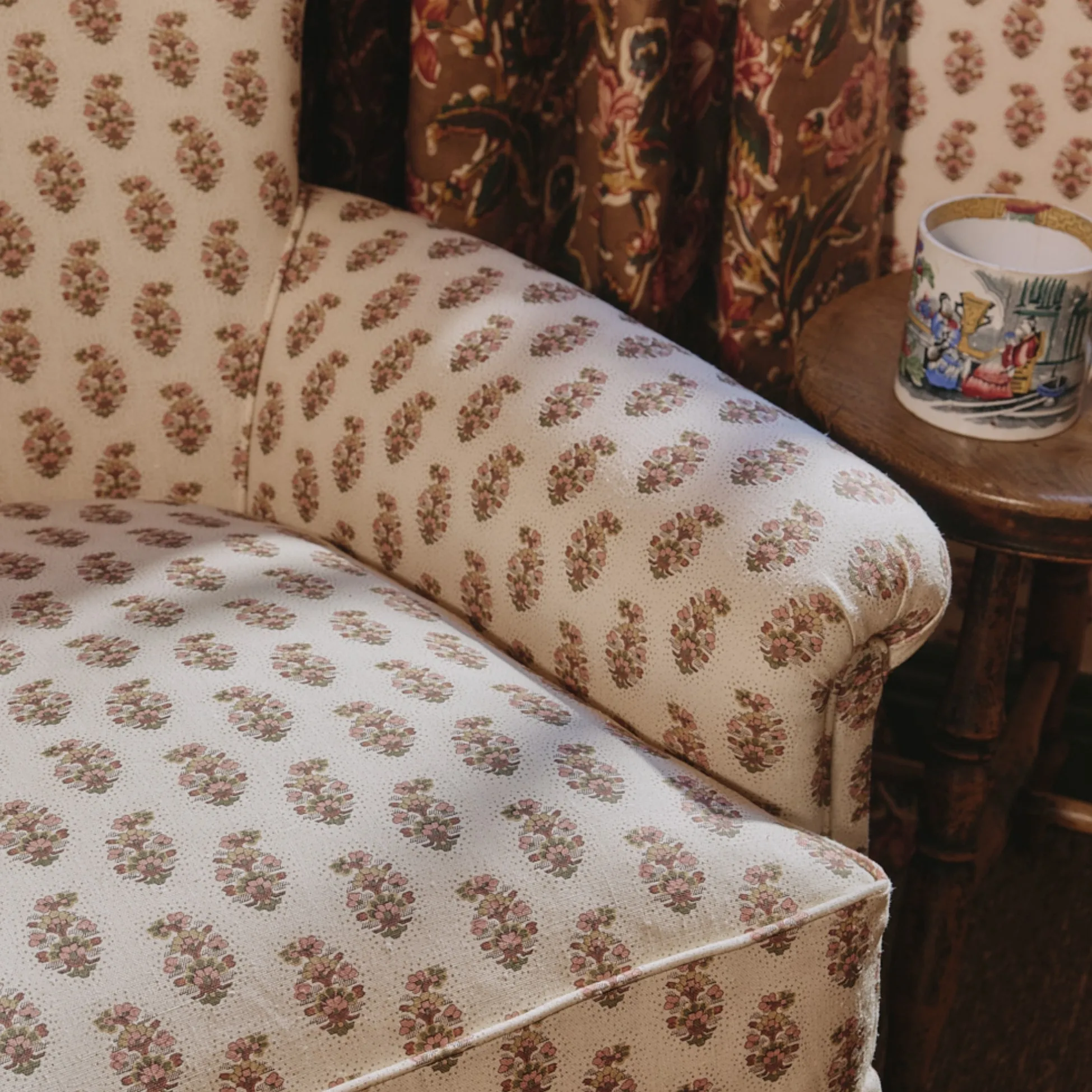 Gussie in Sugarplum showcases the same charming mid scale paisley, highlighted by a balanced blend of blues, pinks and greens on ivory. The dotted elements add movement and dimension, enhancing its layering potential. Crafted from 100 percent hemp, the fabric offers an organic texture with gentle structure and strength, making it both practical and full of character. The palette has been carefully calibrated for a soft yet confident finish.