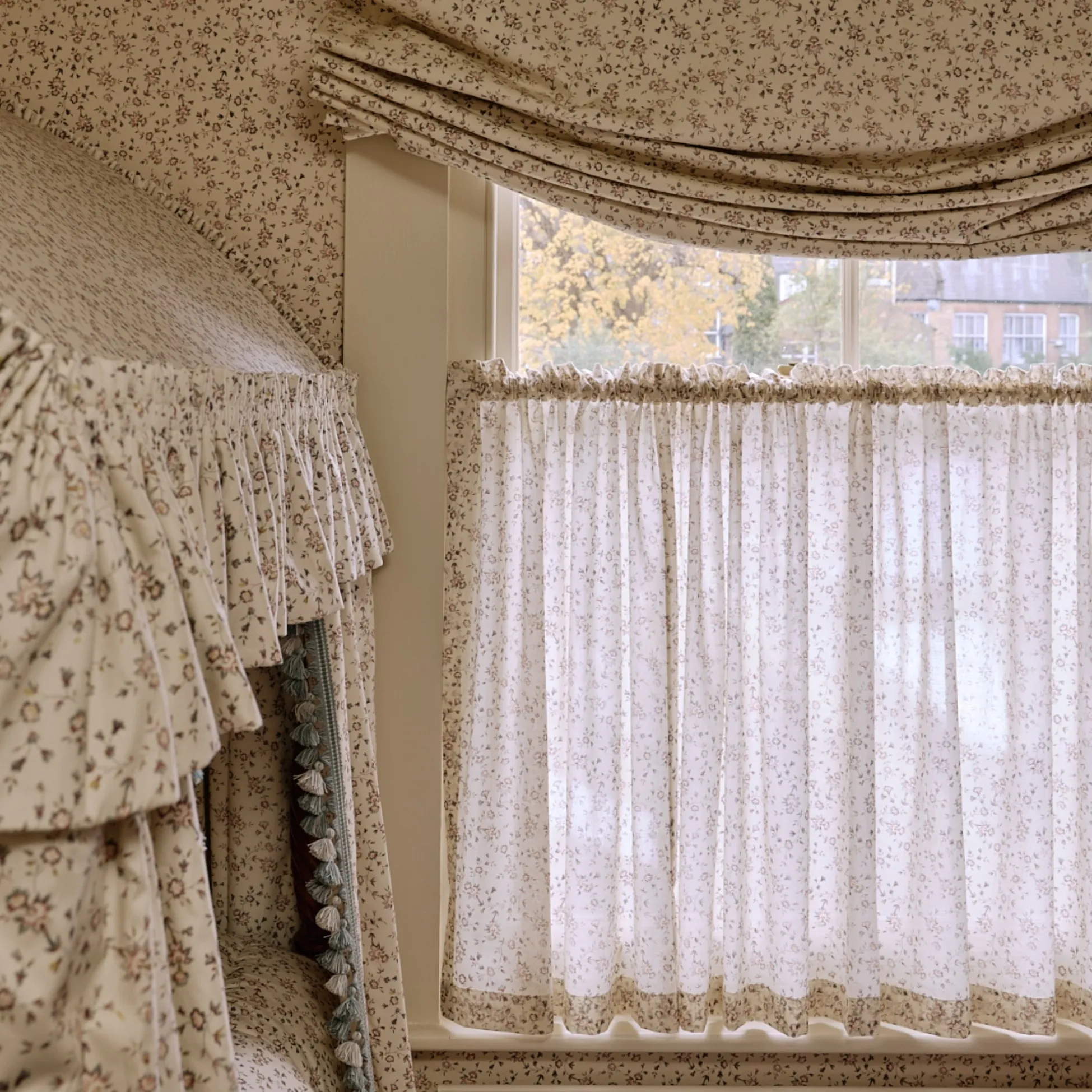 Romilly Rose on voile offers an airy interpretation of the design. The lightweight, softly sheer fabric enhances the small scale motif, giving it a delicate, floating quality. With its gentle repeating pattern, it is ideal for layering at windows, adding privacy while allowing natural light to filter beautifully through bedrooms and dressing rooms.