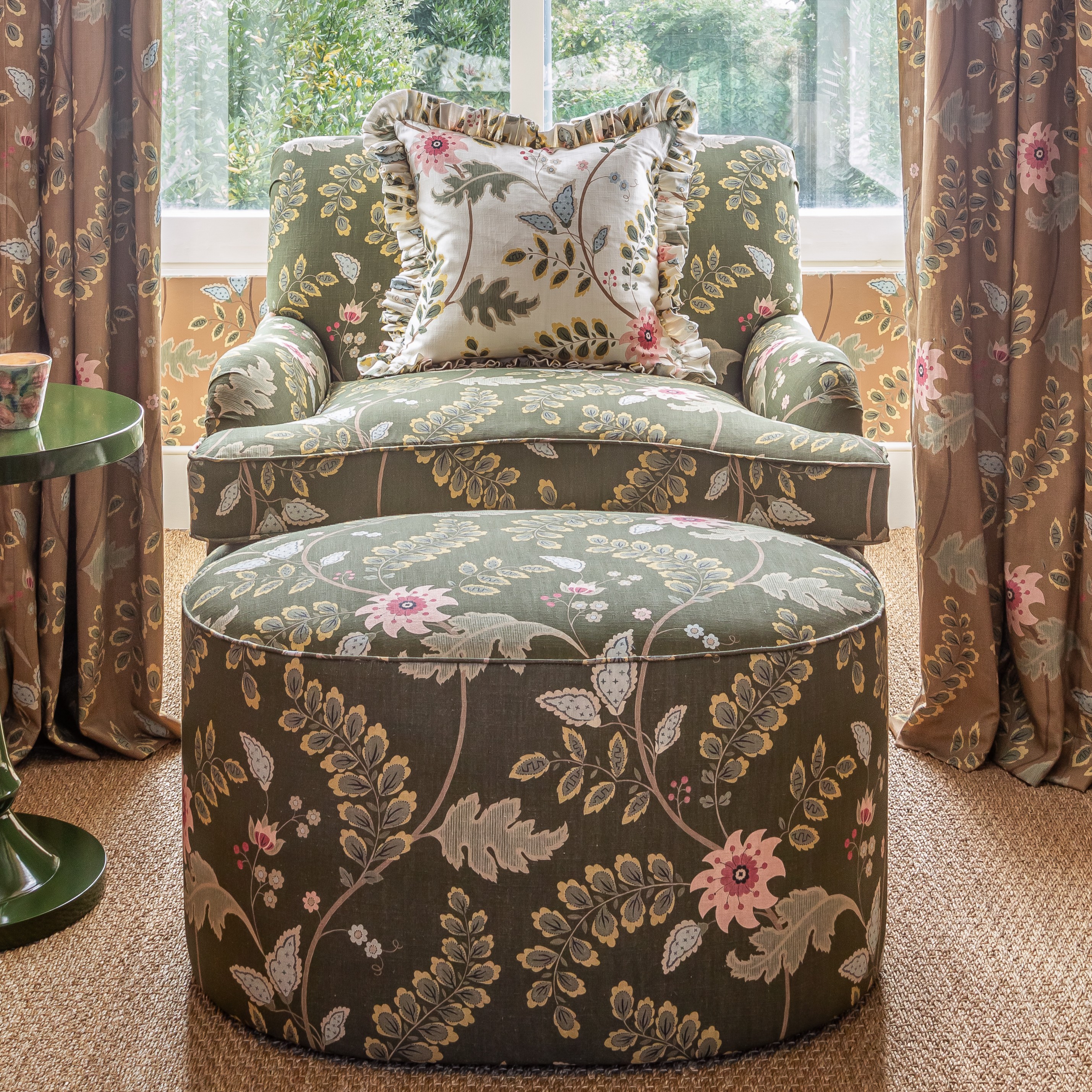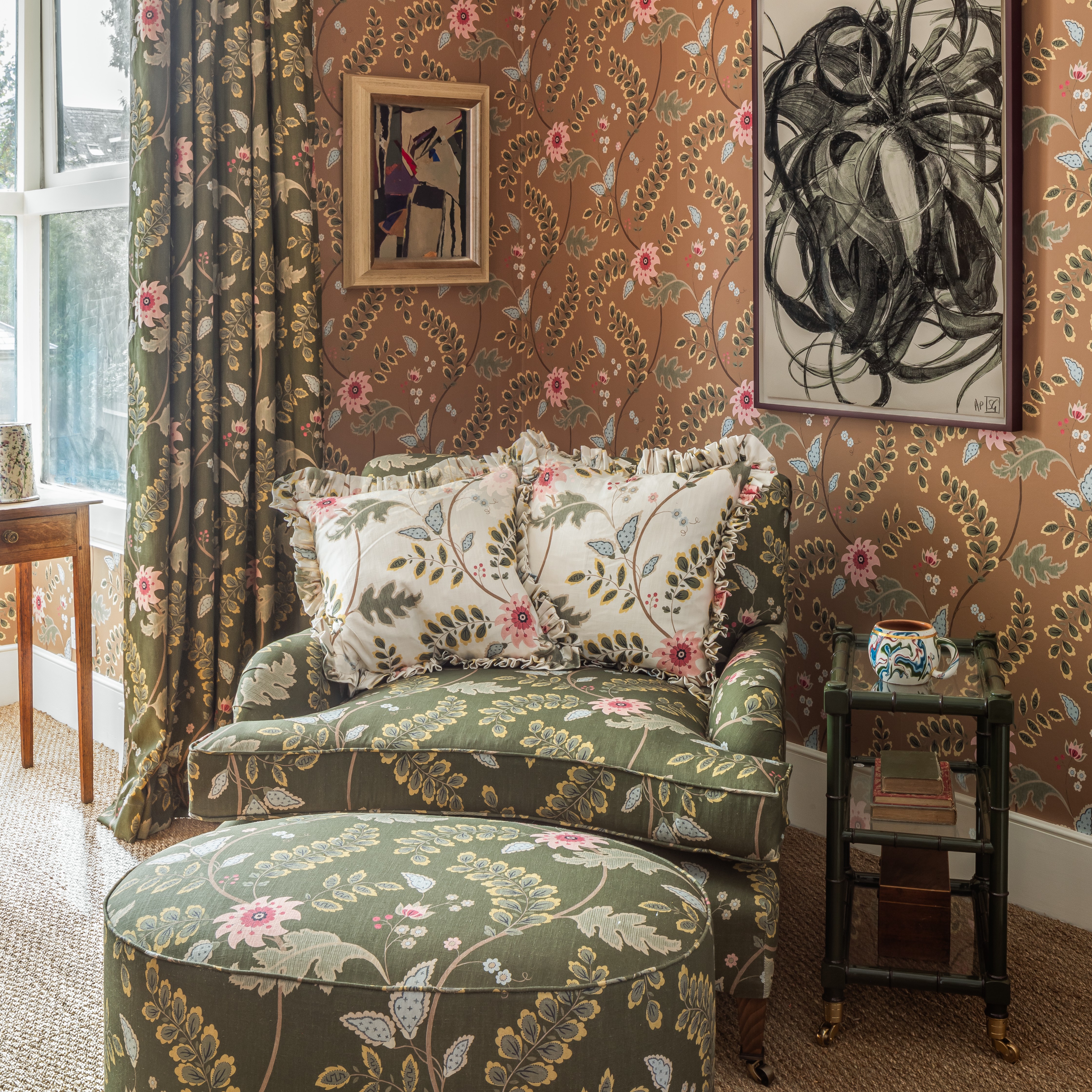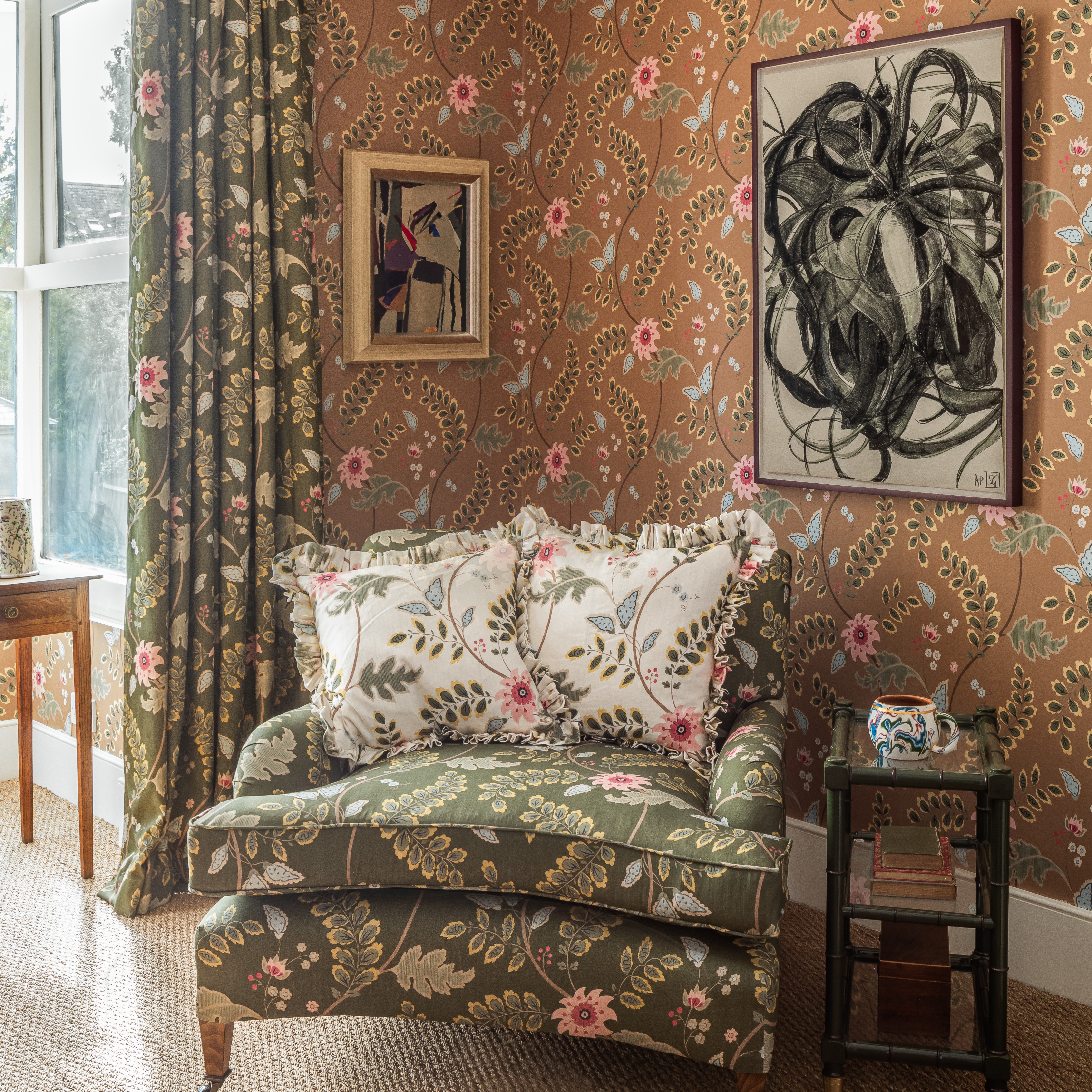 Featuring a complementary palette of pinks, greens and blues, our Floral Trail Fabric takes inspiration from an archive textile design; originally hand painted in France c1810-1820 for a fashion textile. Mary and Nicole wanted to create a floral fabric that was rooted in history but felt contemporary, due to the choice of colour and large scale.