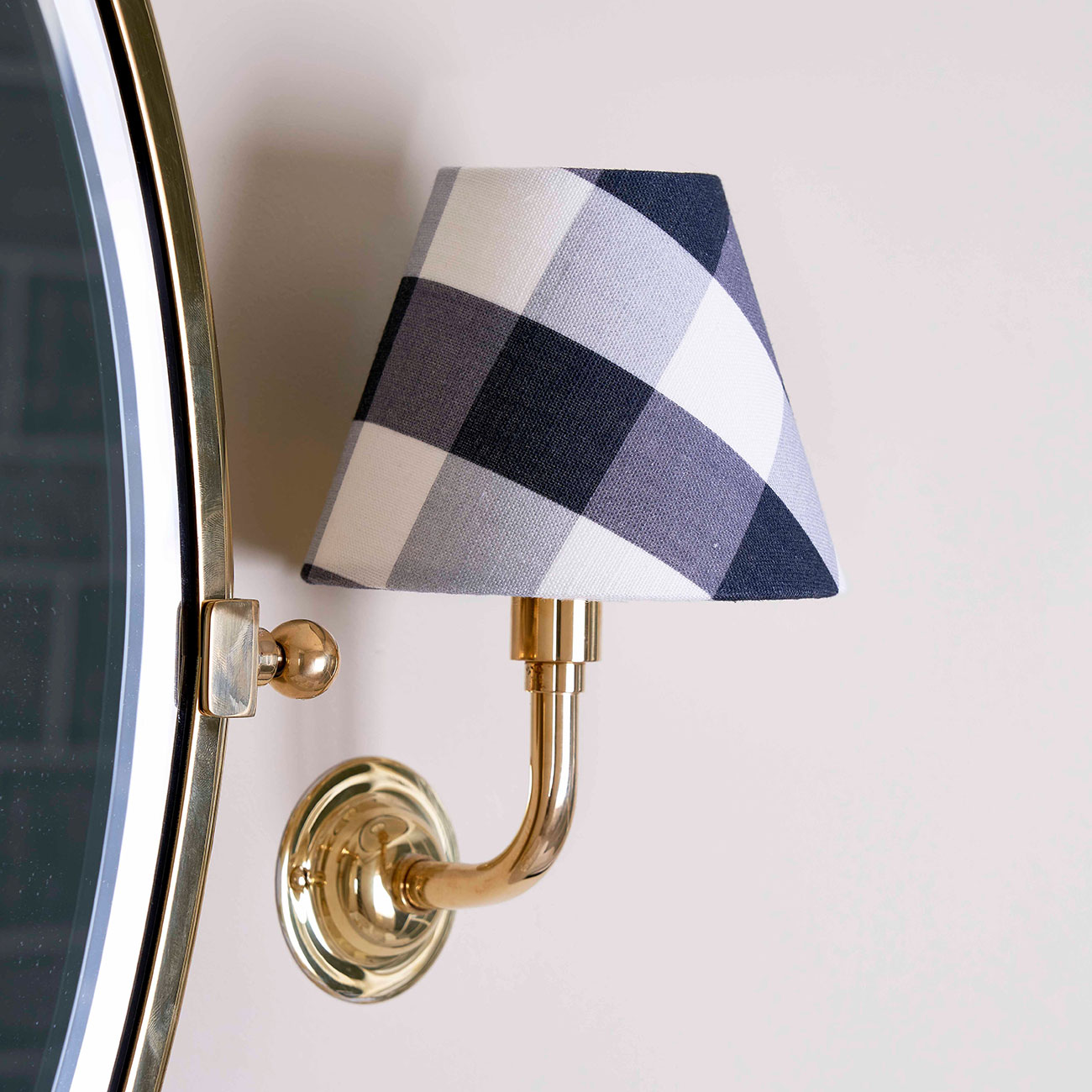 Handmade in London with top and bottom rolled edges and a white interior and empire shape, simply slip the shades onto your small lamps, wall lights and chandeliers. Our shades are crafted from our Little Check linen fabric that is woven in Belgium and printed in England, the soft and slubby nature lends a relaxed and tactile finish to your interior. Mary and Nicole designed the shades with bedrooms and bathrooms in mind, perfect for beside a vanity or to create soft, diffused lighting.